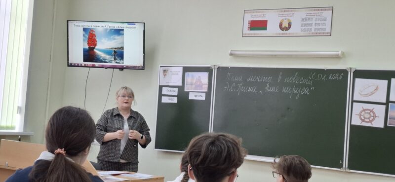 20 февраля в рамках предметной недели гуманитарного цикла Намесникова С. Л. Провела открытый урок русской литературы в 8 “А” классе по теме “Тема мечты в повести А. С. Грина “Алые паруса” . Учащиеся на уроке расширили и углубили знания об произведении, совершенствовали умение анализировать прочитанное, находили ответы на поставленные вопросы, обобщали, делали выводы, формировали умение давать оценку героям и их поступкам, совершенствовали навык выразительного и осознанного чтения.