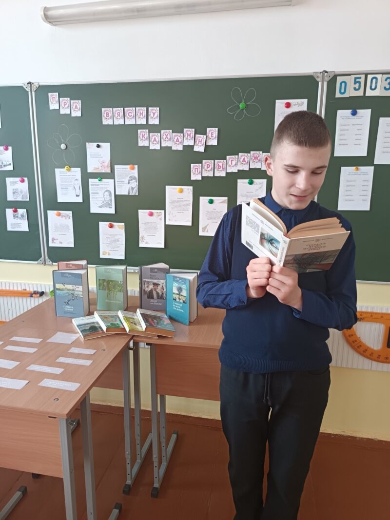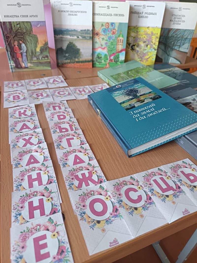 5 сакавіка ў 8 “Б” класе адбыўся кніжны прагляд-настрой “Пра вясну, каханне, прагажосць”. Была падрыхтавана літаратура для вясновага настрою. Экспазіцыя атрымалася пяшчотнай, яркай. Пазнаёміліся са зборнікамі вершаў і твораў беларускіх пісьменнікаў. Паразмаўлялі аб гісторыі святкавання 8 сакавіка і аб выдатных жаночых постацей, якія пакінулі значны след, пісалі цудоўныя творы. Успомнілі вясновы слоўнік, з цікавасцю суадносілі рускія і беларускія словы, перакладалі з адной мовы на другую, чыталі вершы беларускіх пісьменнікаў аб вясне, каханні і прыгажосці. Пазнаёміліся з сучаснымі беларускімі пісьменніцамі (Алена Брава, Людміла Рублеўская, Кацярына Хадасевіч-Лісавая), даведаліся цікавыя выразы на беларускай мове.